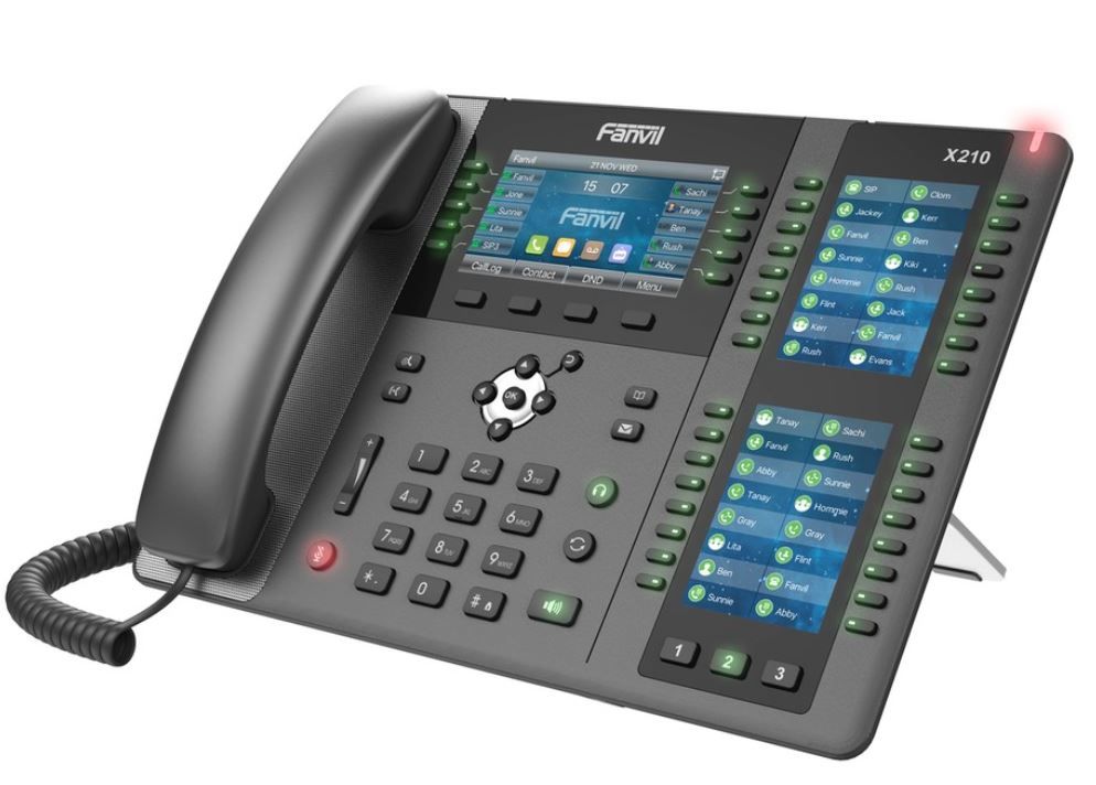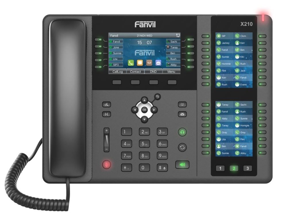 Fanvil X210 to wysokiej klasy telefon IP. Urządzenie ma w sumie do 106 klawiszy DSS, które można ustawić jako BLF, szybkie wybieranie, funkcję nadawania grupowego itp. Wyposażony jest również w dźwięk HD, wbudowany Bluetooth, łączność Wi-Fi, wsparcie EHS, podwójny Gigabit, PoE, integrację kamery IP / bramofonu SIP, zapewniając ogromną produktywność dzięki tym zaawansowanym funkcjom.
